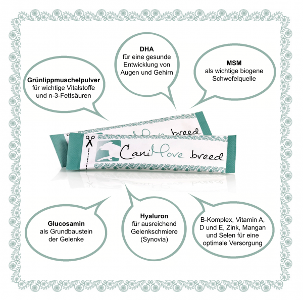 Grünlippmuschelpulver ist reich an Omega-3-Fettsäuren sowie Glycosaminoglycanen. Glucosamin ist der natürliche Grundbaustein des Gelenkknorpels und von entscheidender Bedeutung für den Aufbau der Gelenke. MSM (Methylsulfonylmethan) ist eine biologische Schwefelquelle - Schwefel wird für viele wichtige Körperfunktionen benötigt. Hochmolekulare Hyaluronsäure zeichnet sich durch eine nachgewiesene Bioverfügbarkeit aus: Hyaluronsäure bildet die Grundlage der Synovia, der sogenannten „Gelenkschmiere“. DHA wird vom Organismus für die Entwicklung von Augen und Hirn benötigt. Die enthaltenen Vitamine A, B, C, D und E sind bedarfsdeckend zugesetzt und können eventuelle Mangelerscheinungen effektiv verhindern. Zink und Mangan werden vom Organismus in ausreichender Menge für eine gesunde Entwicklung von Skelett-, Haut, Horn und Fell benötigt.