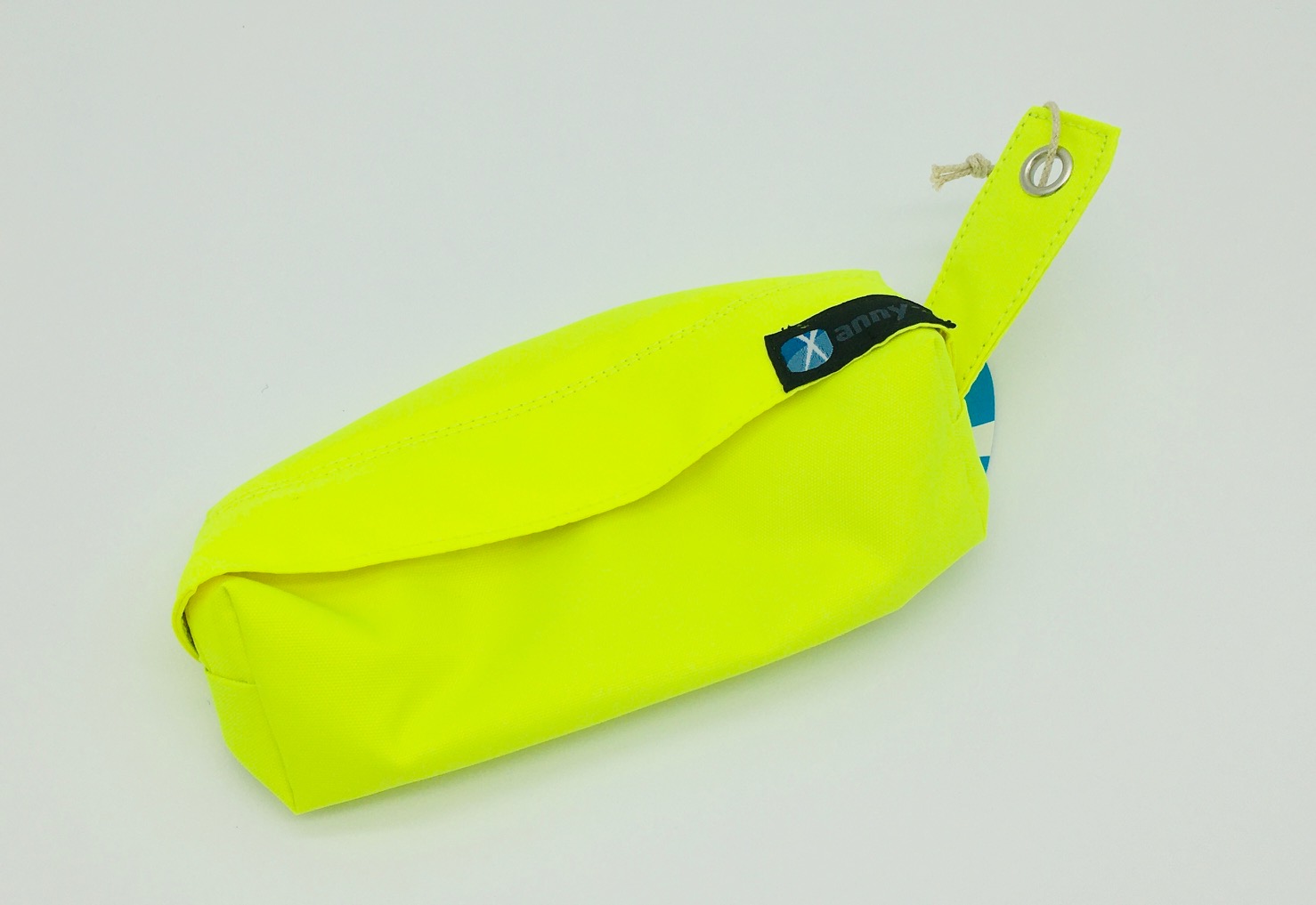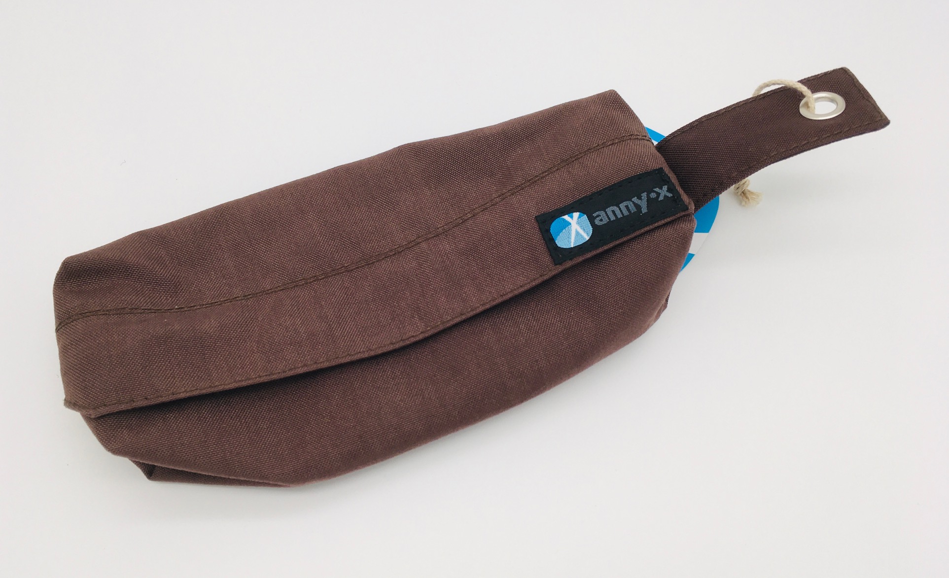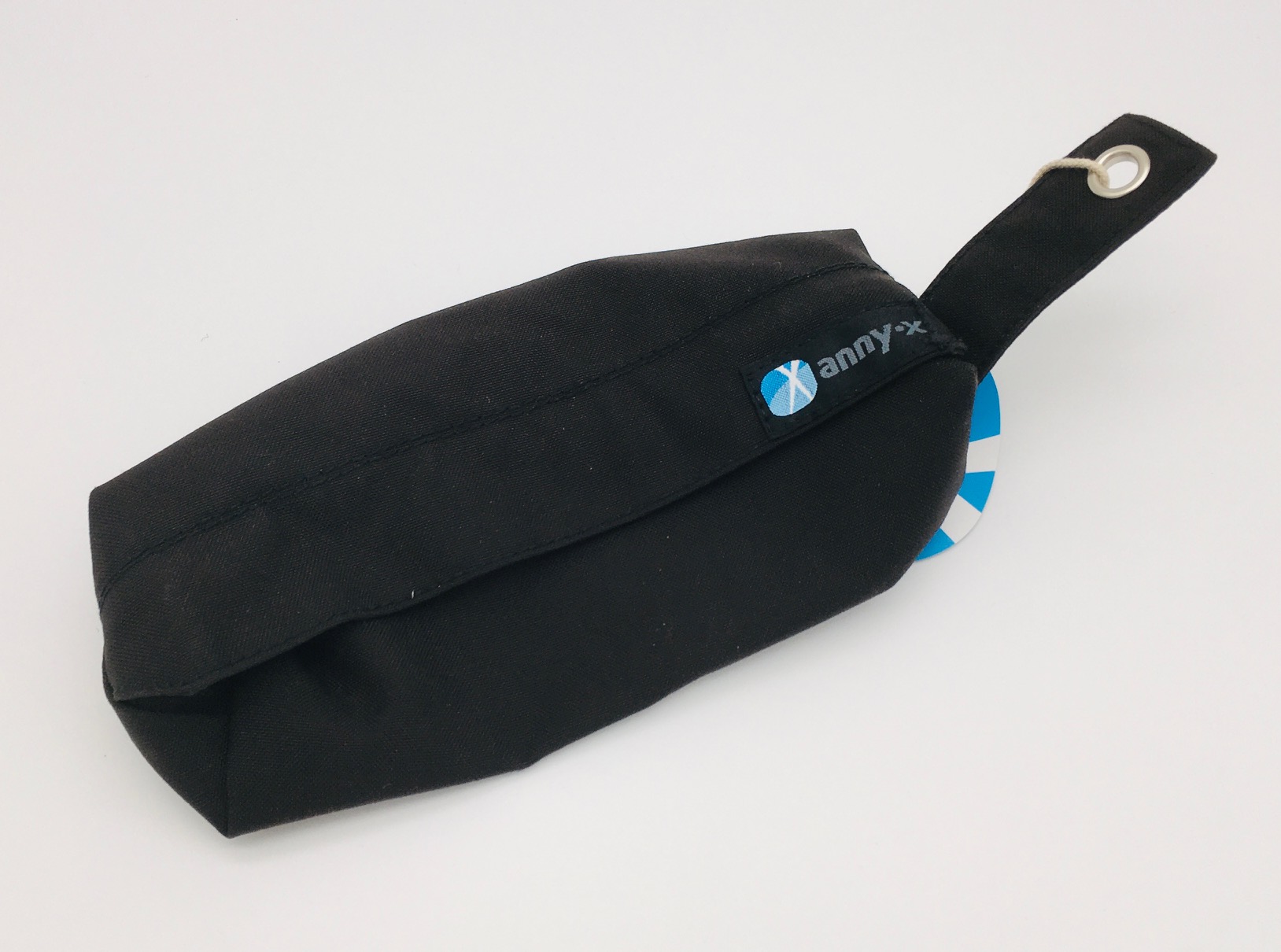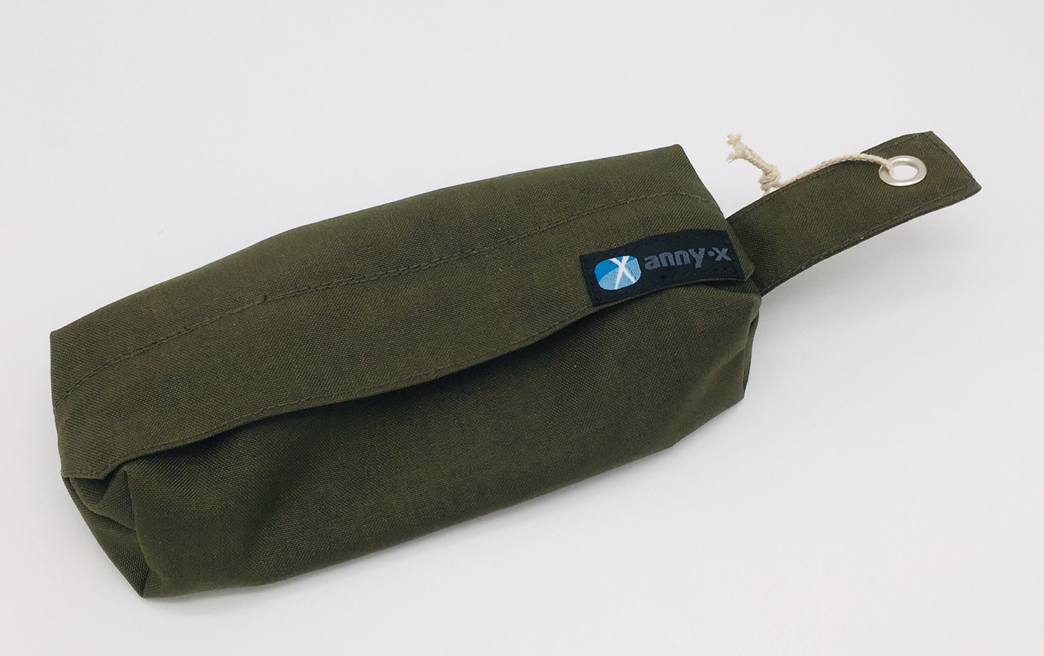 An der seitlich befindlichen Öse kann der Beutel mit einem Karabiner versehen werden, um ihn bequem einer Gürtelschlaufe zu befestigen.