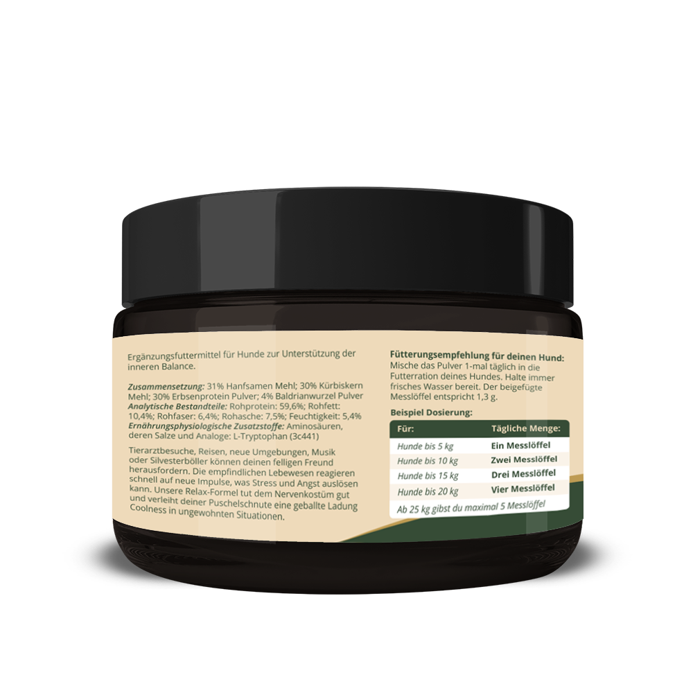 Die Relax-Formel ist ein 100% natürlicher Anti-Stress-Helfer, der deinem Hund hilft, Gelassenheit zu bewahren – egal, wie herausfordernd die Situation auch sein mag. Mit rein natürlichen Zutaten sorgt die Formel für eine beruhigende Wirkung, ohne das Risiko einer Abhängigkeit. Sie hilft deinem Hund, sich in stressigen Momenten schneller zu entspannen und stärkt langfristig das Nervensystem, damit dein Hund auch in der Zukunft mit mehr Coolness durch den Alltag geht.