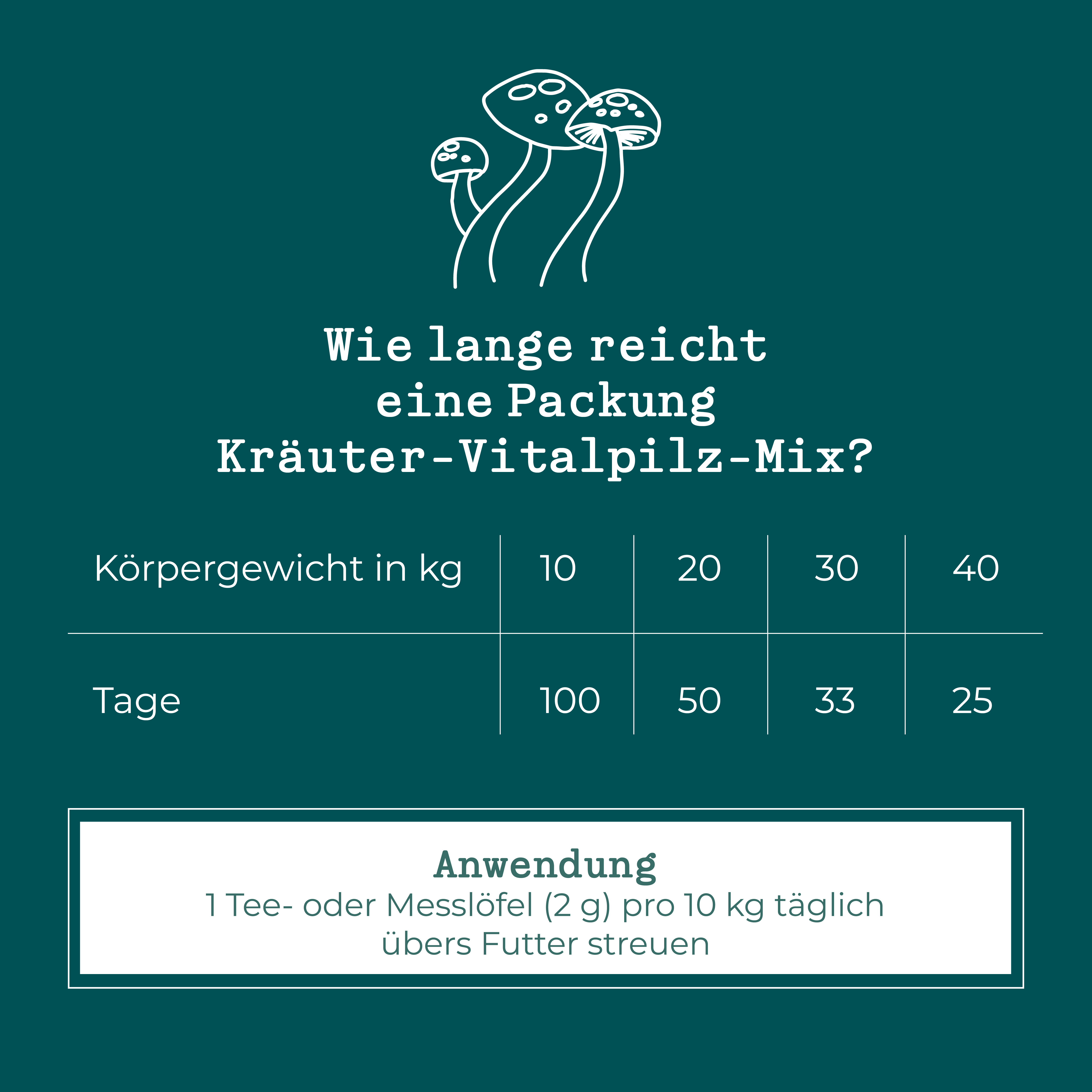 Das Pulver wird täglich unters Futter gemischt. Die Pulvermenge kann auf mehrere Futterrationen pro Tag aufgeteilt werden.